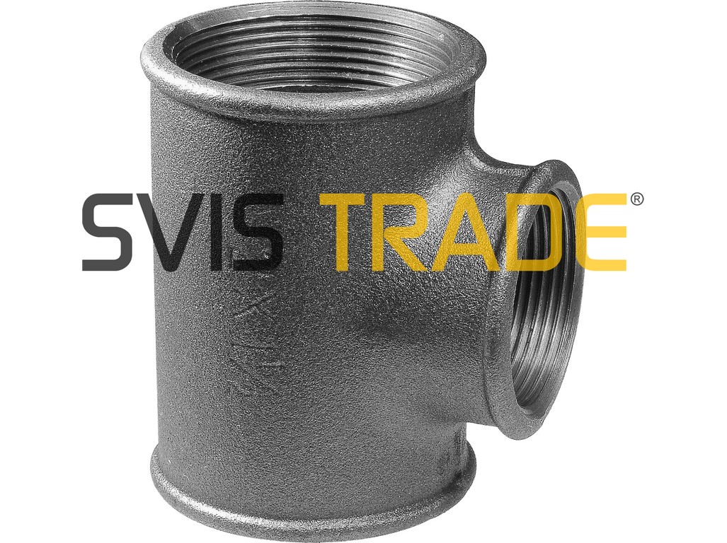 Závitová tvarovka z temperované litiny, druh – t-kus s redukovanou odbočkou a jednoznačným průchodem, s trubkovými závity vnitřní x vnitřní x vnitřní, černé provedení. Vnitřní závity Rc jsou kuželové pro spoje těsnící na závitech dle ISO 7-1.