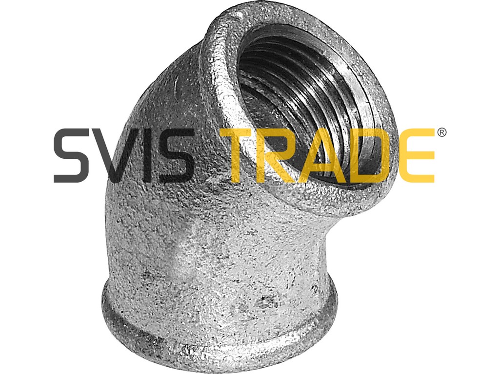 Závitová tvarovka z temperované litiny, druh – koleno 45° s trubkovými závity vnitřní x vnitřní, pozinkované provedení. Vnitřní závity Rc jsou kuželové pro spoje těsnící na závitech dle ISO 7-1.