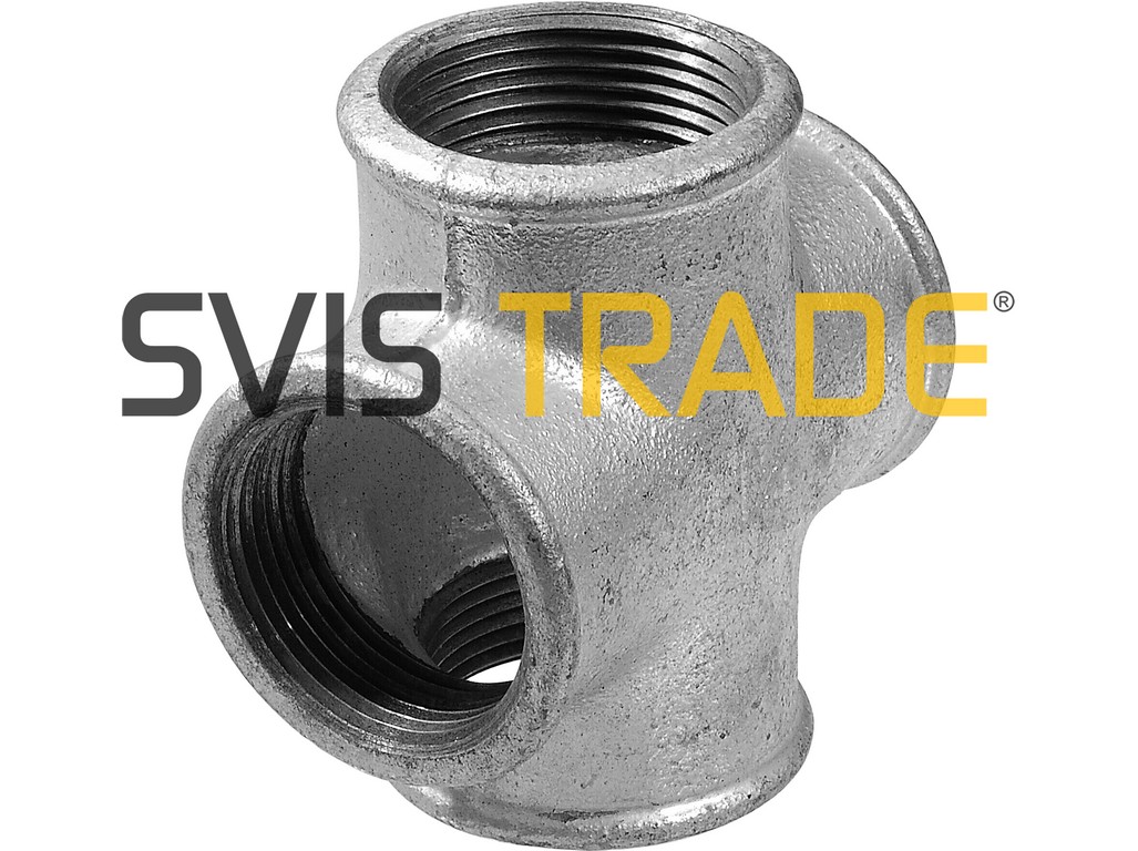 Závitová tvarovka z temperované litiny, druh – kříž s trubkovými závity vnitřní x vnitřní x vnitřní x vnitřní, pozinkované provedení. Vnitřní závity Rc jsou kuželové pro spoje těsnící na závitech dle ISO 7-1.